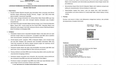 MAJENE – Pemerintah Kabupaten Majene di bawah kepemimpinan Bupati Majene, Dr. H. A. Achmad Syukri, SE., MM, resmi mengeluarkan Surat Edaran Bupati Majene Nomor: B.500.10.6 / 487 / IV / 2026 tentang larangan penimbunan dan peningkatan harga Bahan Bakar Minyak (BBM) secara tidak wajar.