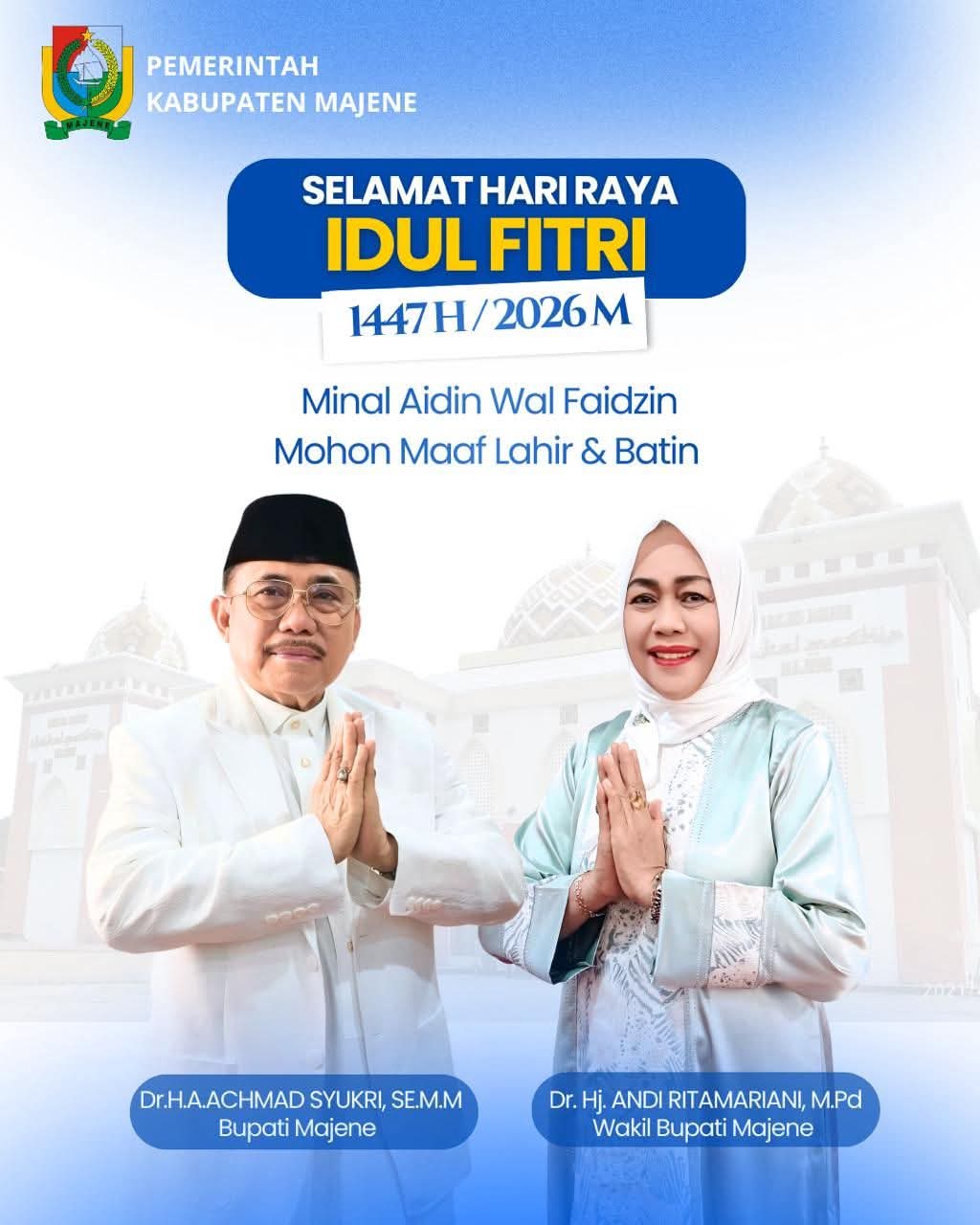 MAJENE,– Pemerintah Kabupaten Majene menyampaikan ucapan Selamat Hari Raya Idulfitri 1447 Hijriah/2026 Masehi kepada seluruh masyarakat. Momentum hari kemenangan ini diharapkan menjadi sarana mempererat tali silaturahmi serta memperkuat persatuan dalam kehidupan bermasyarakat.